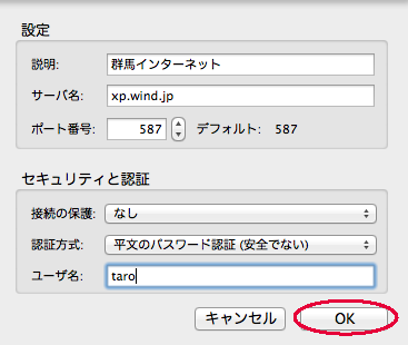 「送信(SMTP)サーバ」の、サーバ名・ポート番号・認証方式を確認し、「OK」をクリックします。